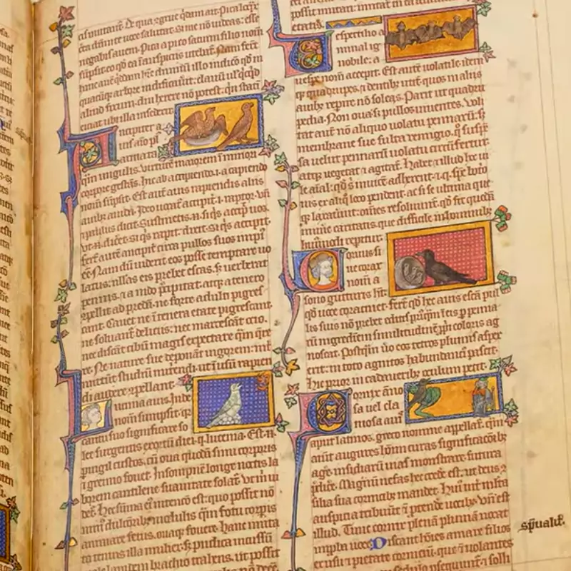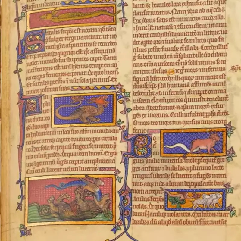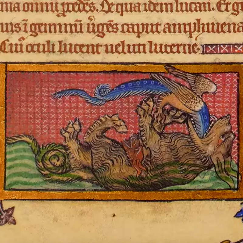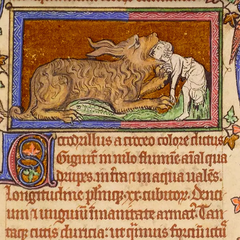 Le Bestiarium de Peterborough est un exemple impressionnant de la tradition des manuscrits de récits animaliers, très populaires au 12e et 13e siècle. Il comprend plus de 100 miniatures colorées représentant des animaux réels (comme des lions et des éléphants) ainsi que des créatures mythologiques (comme des licornes et des phénix). Chaque animal est décrit dans un texte chrétien et moralisateur. Les miniatures, souvent réalisées sur fond d’or, illustrent les passages du texte et sont accompagnées de magnifiques initiales ornées de feuillages.